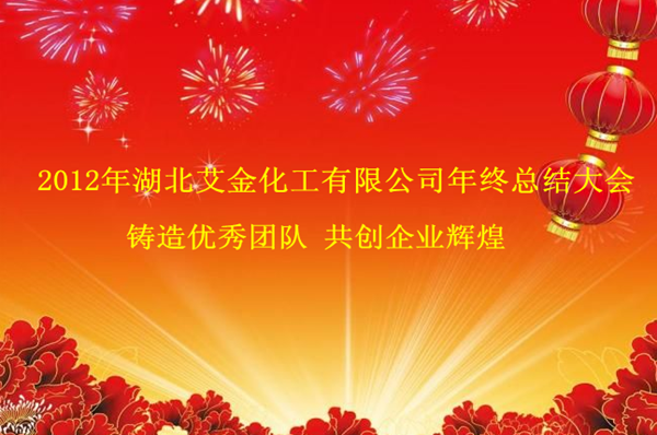 歡聲笑語(yǔ)辭舊歲,張燈結彩迎新年。2015年12月28日,湖北艾金化工有限公司全體員工歡聚一堂,隆重召開(kāi)2012年度總結暨表彰大會(huì )。 會(huì )上,總經(jīng)理作了重要講話(huà),對公司2012年來(lái)的工作進(jìn)行了認真的回顧與總結,全面探討并部署2013年度的發(fā)展思路和工作奮斗目標。最后鼓勵全體員工努力工作,加強協(xié)作,爭取完成2013年的銷(xiāo)售目標。